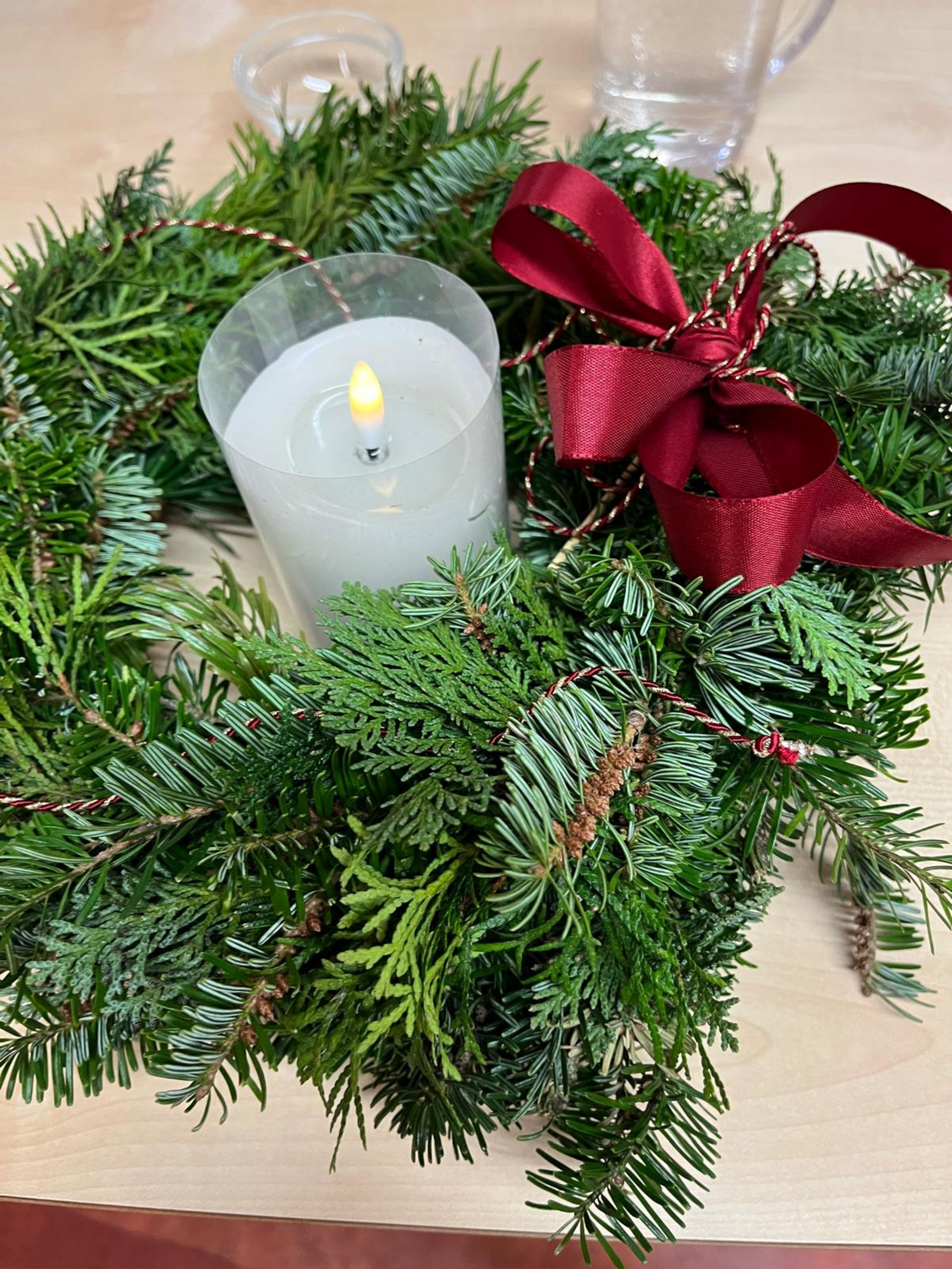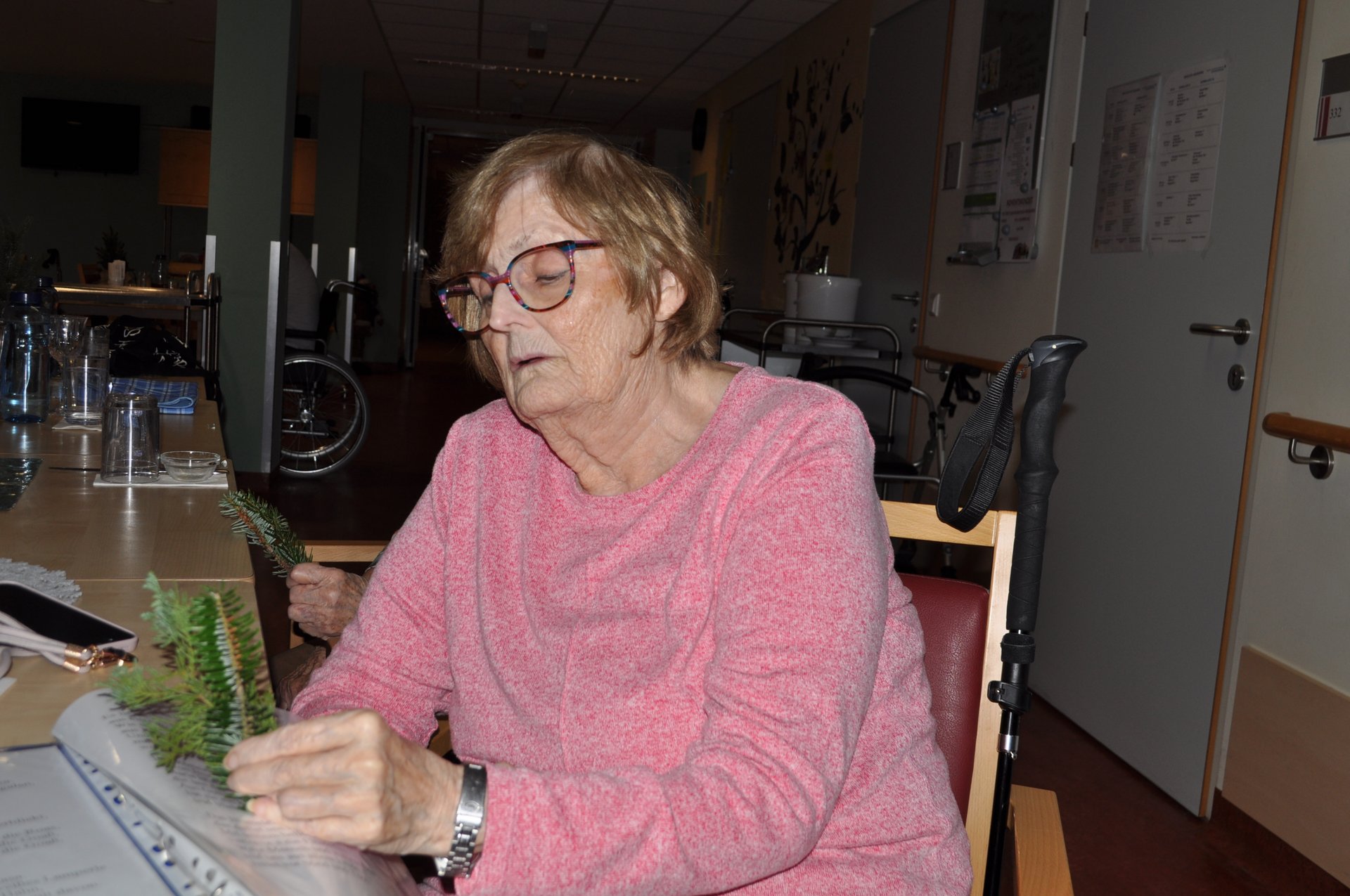 Gemeinsam mit Bewohnerinnen und Bewohnern wurde im Wohnbereich 3 der Adventkranz selbst gestaltet. Mit Zweigen und Dekoration entstand ein schöner Kranz.